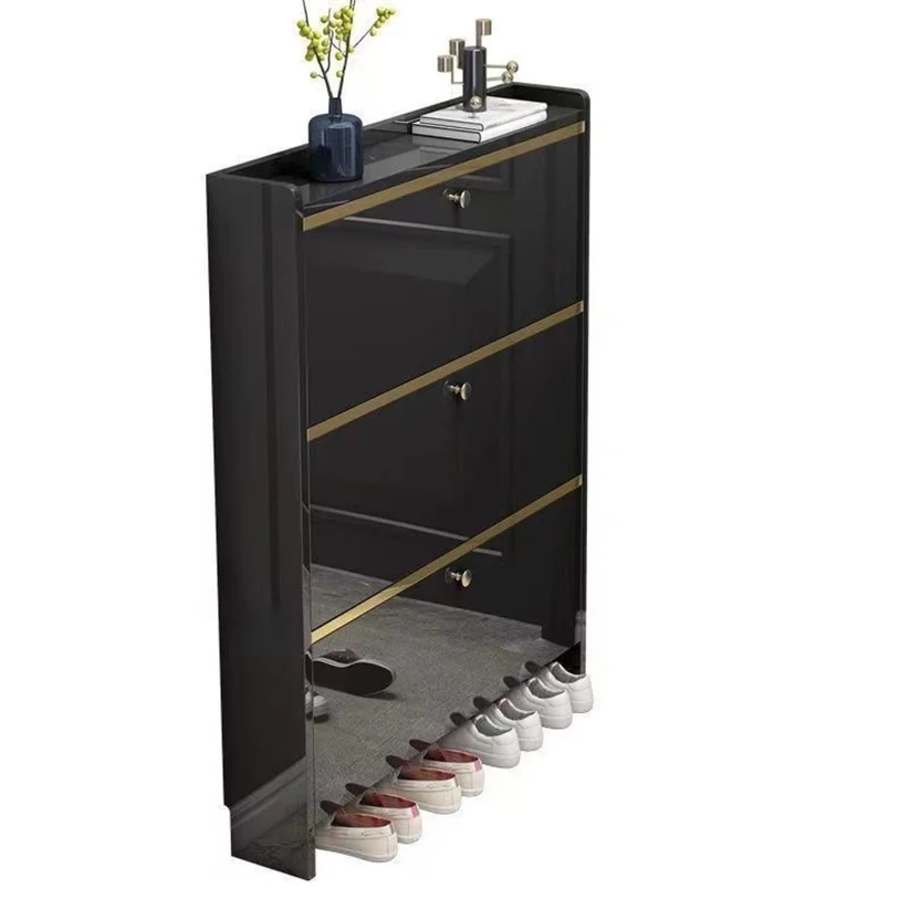The first shoe cabinet features a high-gloss black finish, accented with horizontal gold stripes. The black exterior exudes a sophisticated and modern look, while the gold accents add a luxurious touch. The cabinet has three front-opening compartments, each with a discreet gold knob, providing ample space for shoe storage. The glossy surface reflects light beautifully, making it a standout piece in any room.
