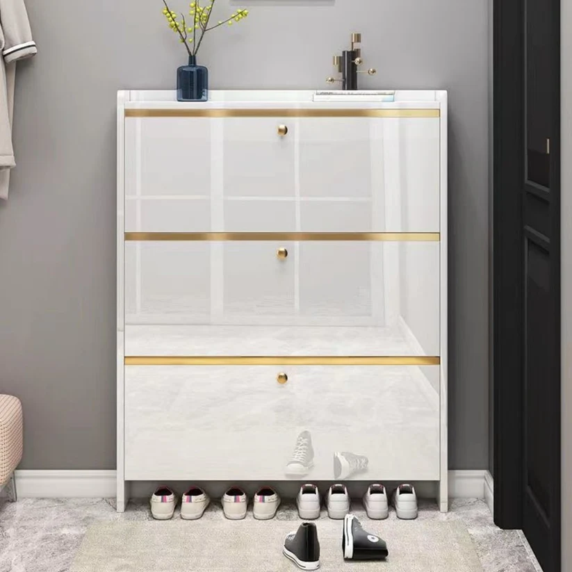 The second shoe cabinet is finished in a high-gloss white with the same gold stripe accents. The white finish gives the cabinet a clean and bright appearance, perfect for adding a touch of elegance to a modern or contemporary interior. The gold accents and knobs are consistent with the first option, ensuring a cohesive design language across both color variants. The white and gold combination is timeless, offering versatility in different decor styles.